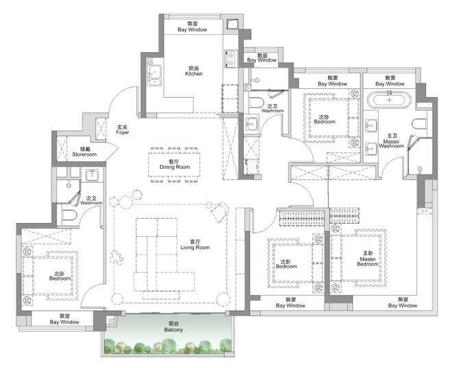 该户型做到了三开间朝南4个飘窗+双面阳台系统+主卧套房设计+270°转角飘窗,该户型的居住体验、舒适度、尺度感,是同级别产品所无法比拟的。