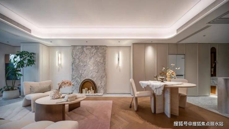 整个室内精装风格为此前大户型中最受欢迎的轻法式设计,弧形吊顶搭配无主灯设计,柔和浪漫氛围十足!还特地在客厅背景墙打造了弧形石材壁炉墙面、地面鱼骨拼实木地板与石材也做了弧形处理,提升空间灵动性,小资惬意~