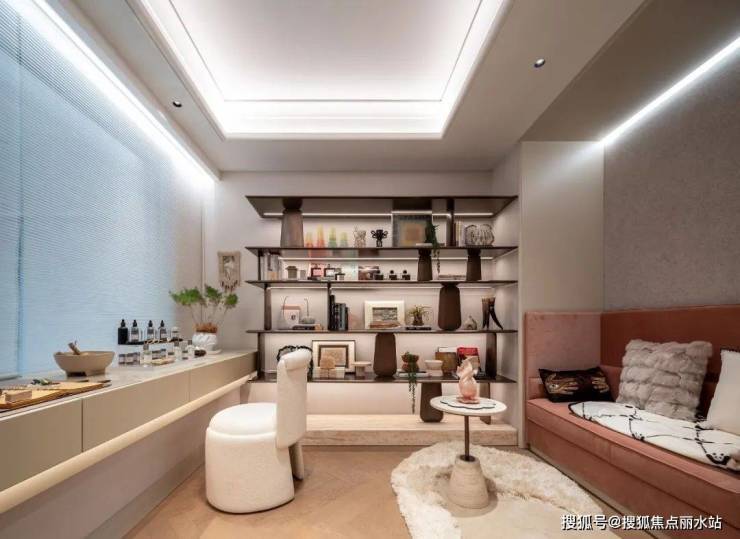 主卧迷你吧山水白大理石包边、背景墙采用奶白色弧形皮革硬包、飘窗法式百叶格栅屏风造型细节拿捏;次卧作为兴趣空间使用,居住幸福感满满~