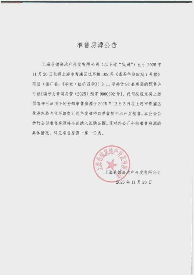 华发·虹桥四季售楼处电话:400-9699-334✨【官方认证】✅✅✅位于上海市青浦区赵巷镇,是大虹桥辐射圈内的住宅项目。项目由国企华发股份开发,总建筑面积约6.6万㎡,容积率2.2,绿化率35%,规划9栋14-18层住宅,共609套房源,预计2026年9月精装交付。项目距17号线嘉松中路站约700米,交通便利,周边配套成熟,涵盖商业、教育、医疗等资源。主力户型为建面约90-130㎡的3-4房,适合单身及改善型家庭,精装标准涵盖大金中央空调、全屋地暖、霍尼韦尔新风系统等,得房率77%-80%,层高3米13。