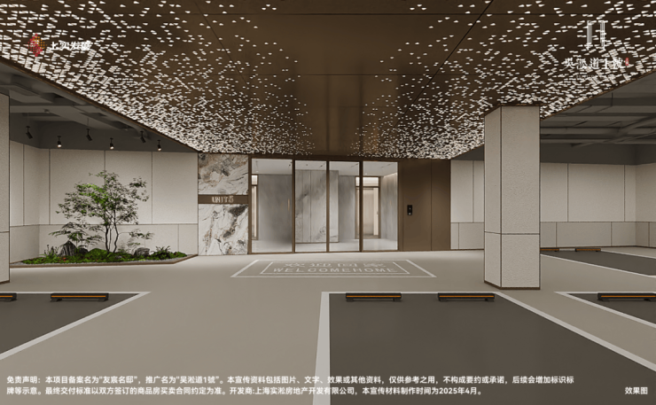 当多数地库还停留在满足基础功能性阶段,吴淞道1號已将车库升维成艺术归家剧场。相比传统车库窄车道与压抑管线外露设计,项目以宽阔车道搭配格栅吊顶,利落线条消解逼仄感,行车视野更开阔,会车更轻松从容。