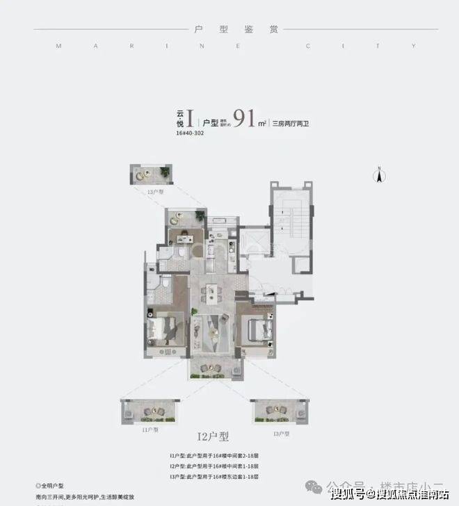 建面约91平方米的三房两厅两卫户型,备案价总价区间为383万到460万元。这一户型采用三开间朝南的飞机户型设计,客餐厅厨一体化布局,搭配大尺度观景阳台。打完折315万起