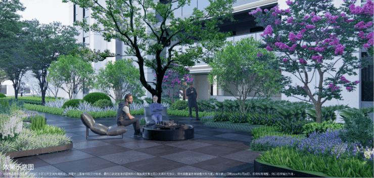 国际象棋雕塑打造的棋牌休闲花园,搭配紫薇、香橼、朴树等高大的灌木,营造一处林下的闲适空间。