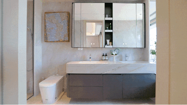 主卫同样配有纵向飘窗,空间通透敞亮,毫不压抑。全明卫生间配置高端体验,选用恩仕智能马桶,汉斯格雅龙头花洒与杜拉维特台盆共同打造高品质洗漱动线,线性浴霸实现快速均匀取暖。镜柜巧妙收纳日常用品,让台面长久整洁清爽,更特别配备美妆冰箱,贴心照顾护肤需求。