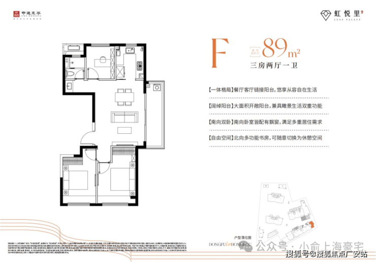 79㎡两房采用横厅设计,连接约6米景观阳台,实现小户型的宽敞感
