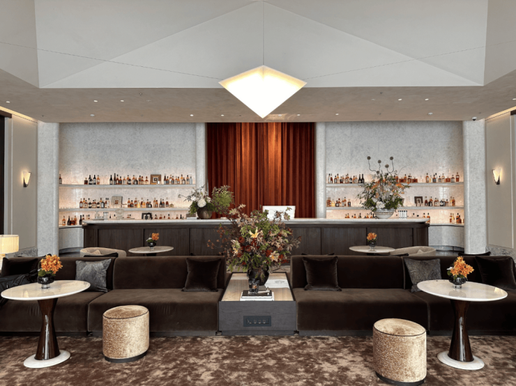 约7.9米挑高的酒店大堂顶部,用一整块玻璃打造的全景天窗,营造出了天光漏隙的隐奢感,光照进来,整个纵向的空间感,更加强烈。