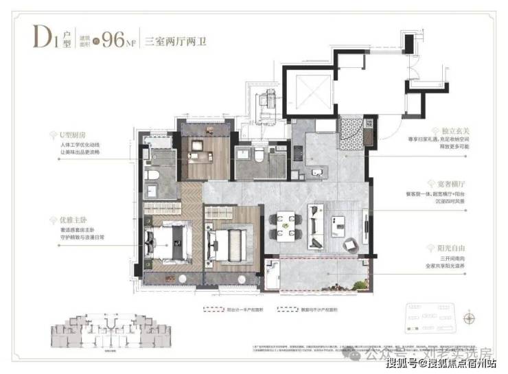 ①建面约96㎡3房户型: