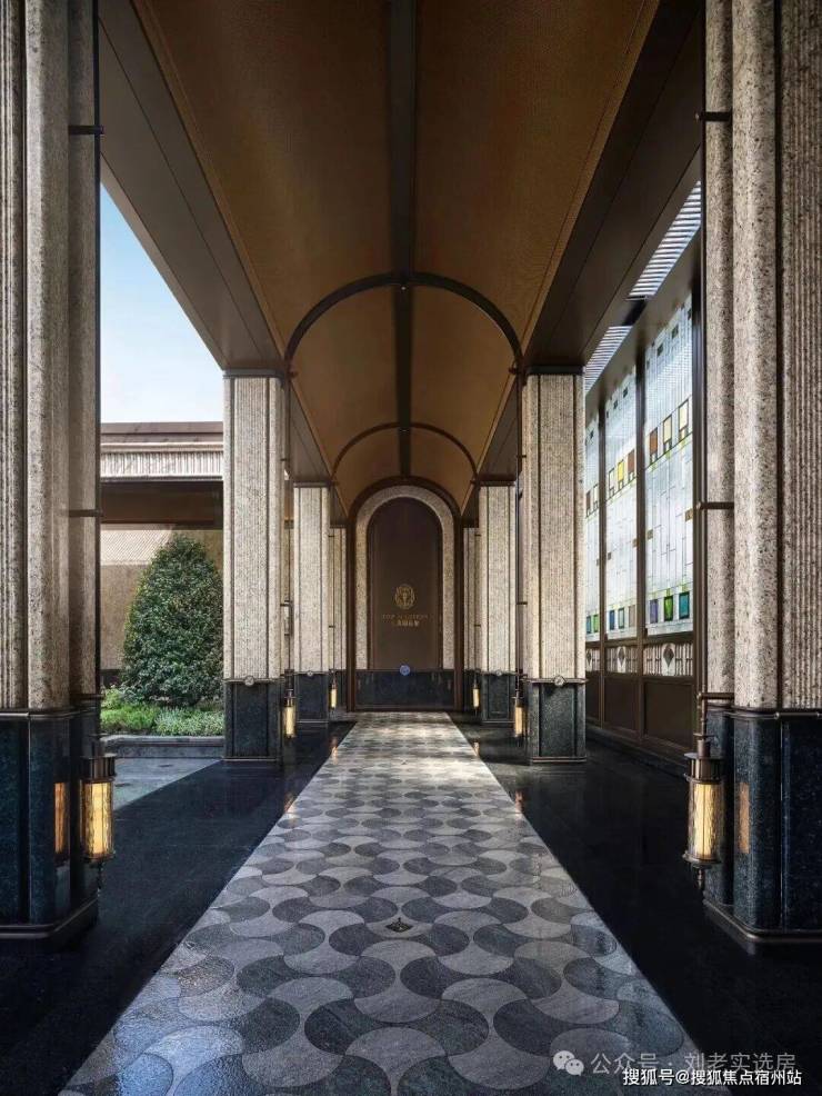 其次,项目的很多细节都融入了海派经典元素,比如落客区美轮美奂的约300㎡彩色玻璃穹顶,艺术连廊拱形廊道灵感都来自和平饭店。彩绘花窗的拱门造型则取自武康大楼。