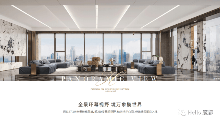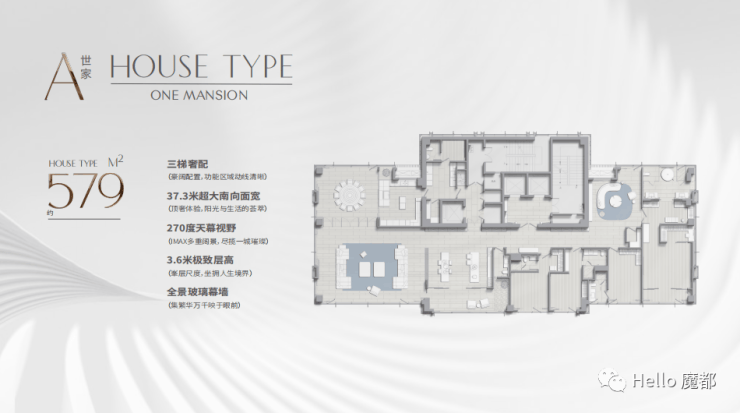 579㎡五房四厅六卫:三梯一户设计,南向面宽达35米,客厅进深17米,270°环幕玻璃幕墙