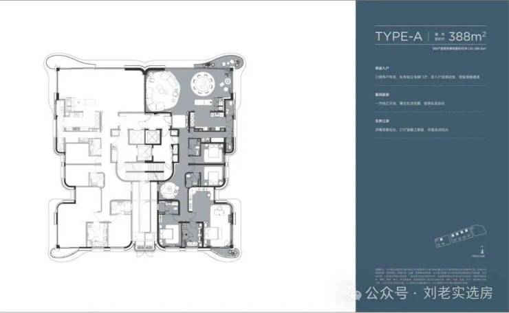 这个户型与建面约240㎡的产品相同,都是三梯三户的设计,尊享独立电梯厅。