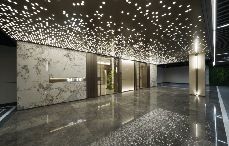 从项目南入口,穿越前厅的潺潺水景,便是与社区建筑完美融合的门厅大堂,其设计简约而不失精致,摒弃繁复细节,彰显出新海派独有的高雅格调。