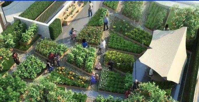 屋顶菜园:城市田园梦,人与自然的乌托邦(此处指配套用房屋顶)。一块小菜地,可以唤起人们对土地和自然的亲近感,也能让一家人在照料蔬果的时光里,创造美好、独特的共同回忆。