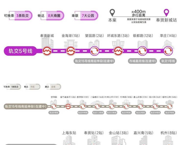 交通方面:项目多轨交环绕,5号线、15号线南延伸段(在建中)、市域嘉闵线南延伸段(规划中)、沪乍杭高铁(规划中)及南枫线(在建中)