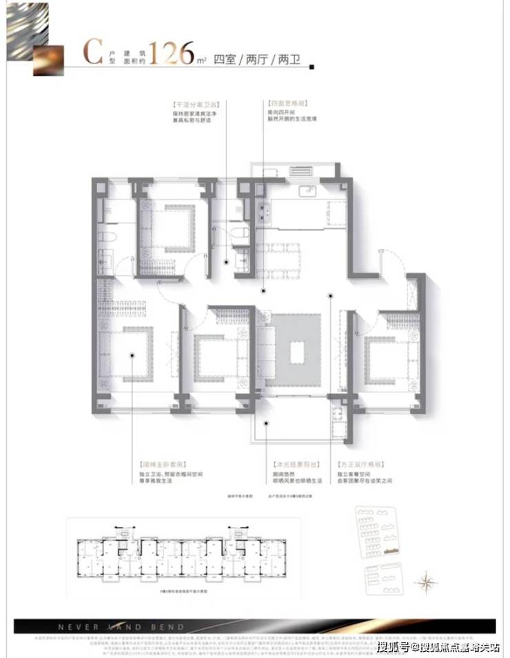 建面约126㎡四房两厅两卫, 更大限度保留了南向房间,四开间朝南,并且是 LDKG一体化设计全飘窗设计, 更大大增加了室内尺度感和实用空间。