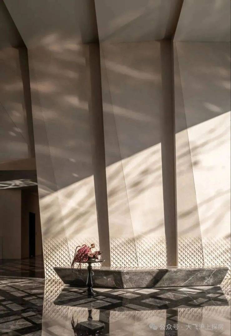 会所墙面采用菱形钻石切面,是翡雲悦府设计团队,专门开矿甄选,2万平方内只挑选最好的1/10版面,以3倍石材厚度,进行雕刻。