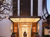 架空层深灰色石材与古铜色金属组合,屋顶彩釉玻璃搭配香槟金铝板,营造历久弥新的建筑质感