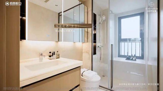 卫生间镜柜与预留洗地机位的台下柜,招商时代乐章售楼处电话 400-8787-740 ✅✅方便清洁用品的收纳,创造独立的家政清洁收纳空间。内嵌LED灯带的防雾镜柜,方便沐浴后的护理与美肤。