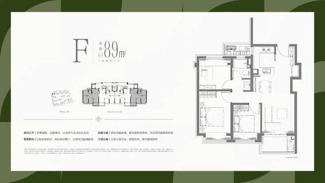 1、全部南向大面宽设计,保证最为出众的采光和视野需求;
