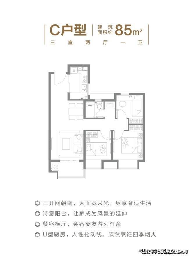 建面约85㎡的3房2厅1卫,低总价强功能三房,三开间朝南+整体动静分离的设计,都保证了这个户型的居住舒适度。