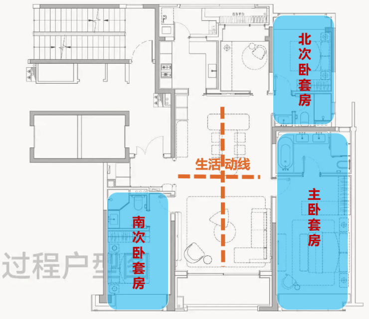 南向双套房+北向类套房设计,使三个房间分散于房子的三个方位,内部私密性十足。