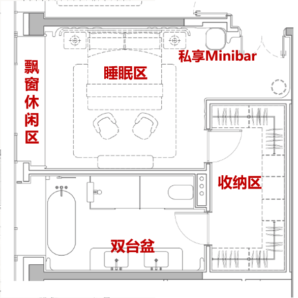 在主卧配置了睡眠区、休闲区、收纳区以及夜间会客厅私享Minibar,四大功能共同构筑了一个功能完备、无须外求的私享世界,真正实现了“主卧即度假”的顶级生活愿景。