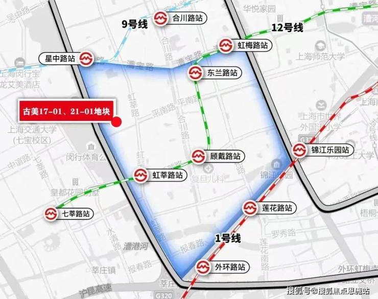 地块坐标古美板块西面,东至星中路、南至平南路、西至智联路、北至宝兰路,距离9号线星中路站、12号线虹莘路站直线距离约1.3公里。地块上游是金虹桥板块,下游则是莘庄。