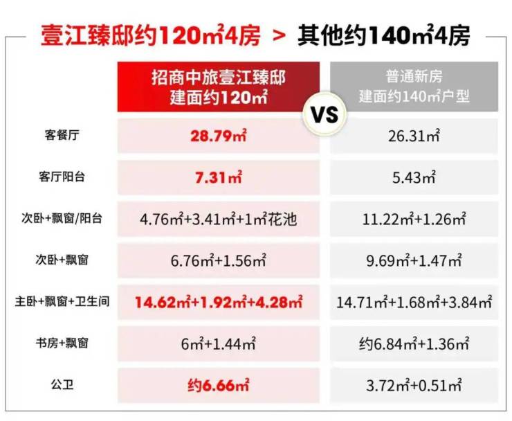 在与建面约140㎡左右的大4房的对比中,壹江臻邸客餐厅、客厅阳台、主卧、公卫的空间都更大。