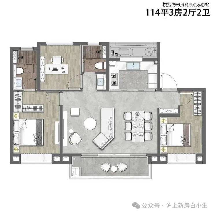 该户型做到了三开间朝南+超大面宽横厅+主卧套房设计+卫生间干湿分离+南北通透,功能性和尺度感完美结合。