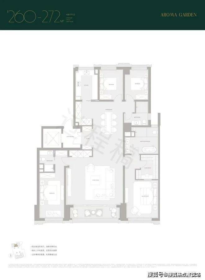 建面约260/272㎡,南向双套房,尤其主卧是豪华套房,带独立衣帽间,卫浴间含双台盆+淋浴+浴缸+马桶四件套。