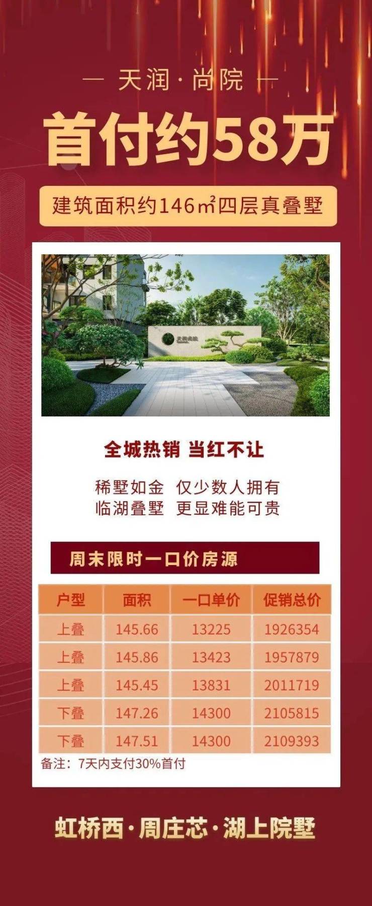 天润尚院 售楼处电话:400-8866-340☎【已认证】好消息!总价190万买别墅!去哪里找?即将加推!低密度别墅 5A级景区,建面146平真叠加别墅!首付约58万起