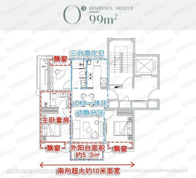 三开间朝南设计,南向面宽约10米,约99㎡中高区直面滨江,采光视野相当不错;