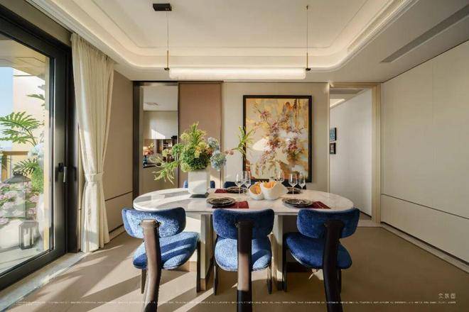 厨房、餐厅、客厅及阳台一体化设计,空间通透、尺度奢阔;