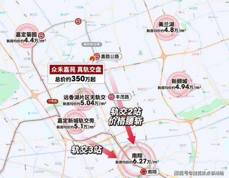 另外,距众禾嘉苑仅一站的丰茂路站,即为一主二辅枢纽体系中的嘉定东枢纽,是嘉闵线、宝嘉线的换乘站,2站内三轨交环绕的交通格局让这个项目拥有非常强大的人口导入能力、交通出行便捷度。