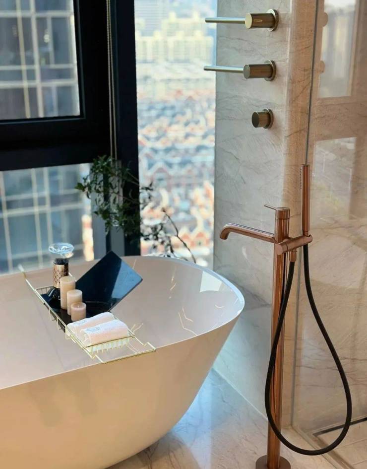浴缸选用瑞士劳芬,水龙头、花洒选用意大利GESSI,每一处细节都彰显着奢适与品质!