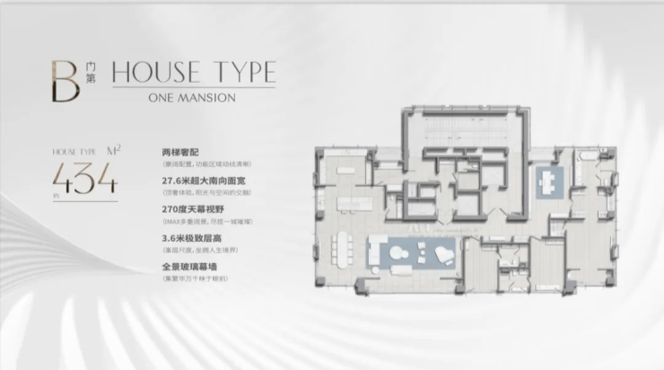 除了稀缺的地段优势,其产品设计别出心裁!以建面约435㎡的产品为例,其在空间尺度、功能布局和景观视野方面,都展现出了优势!