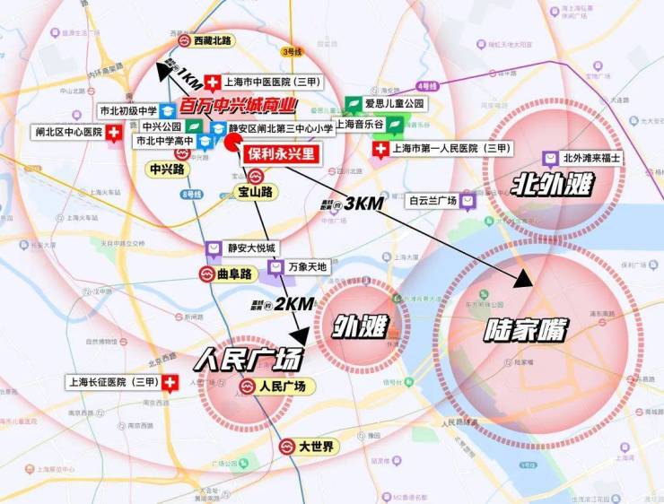 保利永兴里所在的区域与传统市心的距离上有非常大的优势,项目直线距离3公里有南京西路、人民广场、外滩、外白渡桥等核心商圈及地标。