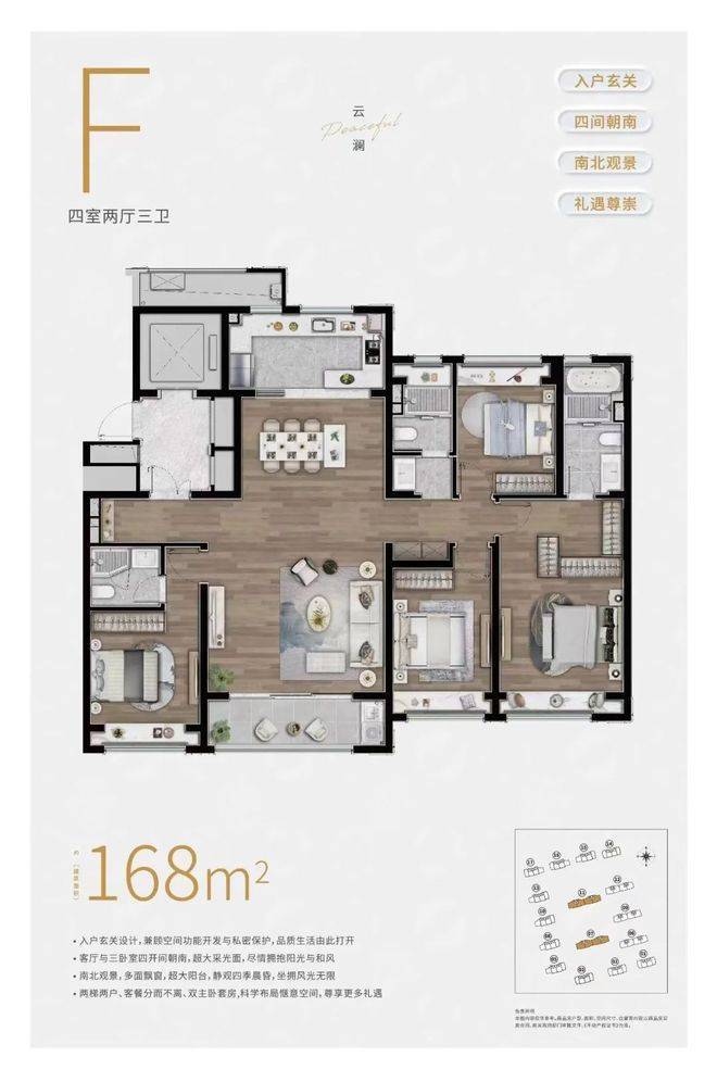 另外,四房户型双房朝北似乎是逃不开的问题,但陆家嘴锦绣云澜这个建面约168㎡的4房却做到了三间卧室全朝南,并且南向双套房设计。
