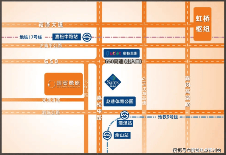 交通方面,项目距离最近的地铁站是9号线佘山站,步行有一些距离,日常出行需依赖自驾。约2.5公里即达G50高速入口,临近嘉松中路、沈海高速、嘉闵高架路等主干道,可以快速直达虹桥商务区。