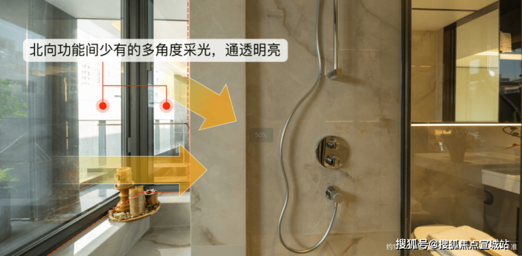 相比常规户型只是全卧飘窗布置,Bund98户型不仅厨房带飘窗,主卧和两个卫生间更带双侧采光的270度飘窗,总共七个飘窗,飘窗不计入建筑面积,附赠远超常规户型。
