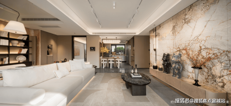 比如墙面使用大量温润木饰面铺陈,电视背景墙选用岩板,客厅地面铺设云朵拉灰石材、餐边柜台面镶嵌卡里冰玉大理石,将高级感渗透到生活的每个角落。