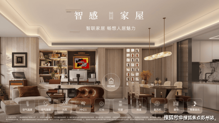 室内空间:引入了全屋智能家居系统,能通过App、中控、语音三大方式,调节全屋智能家居,包括客厅灯光、空调、地暖、新风、客厅和主卧窗帘等场景。