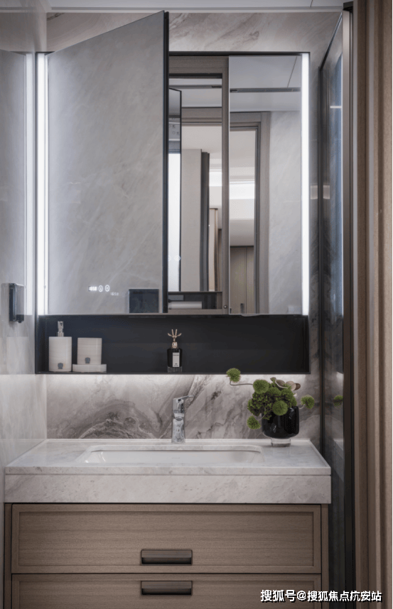背后主墙面采用岩板设计,经久耐用,内部还收纳细节还预留4孔电源,电动牙刷、卷发棒等吹风机收纳孔、洗脸巾抽取孔。