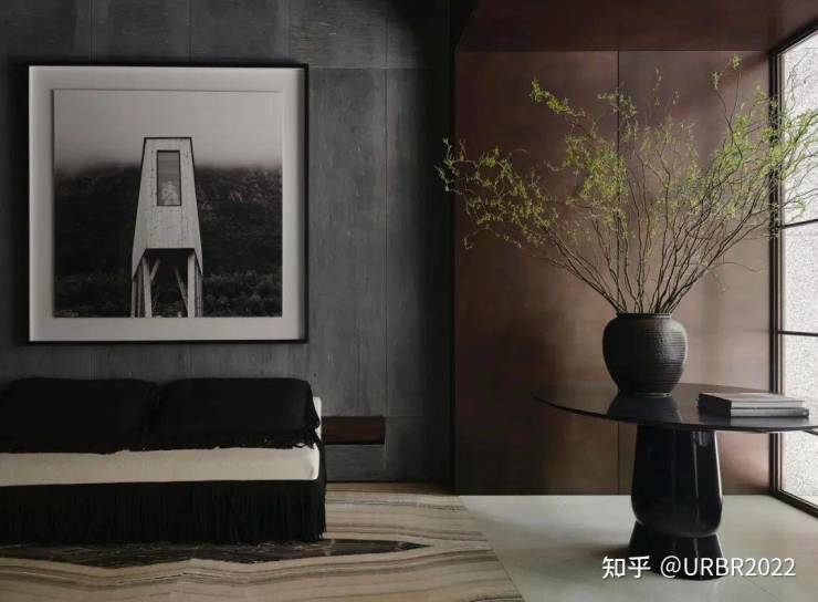 家具粗粝而温润,似记忆中被反复抚触的老物件,带着时间沉淀的温度。粗粝的石材沉稳克制,温润的木质收束情绪。使人联想到安东尼奥尼《红色沙漠》对环境与心理感知的塑造——空间是情绪的投射场,人在不知不觉中被空间的叙事所包裹,最终沉入一场无法割裂的感官体验。