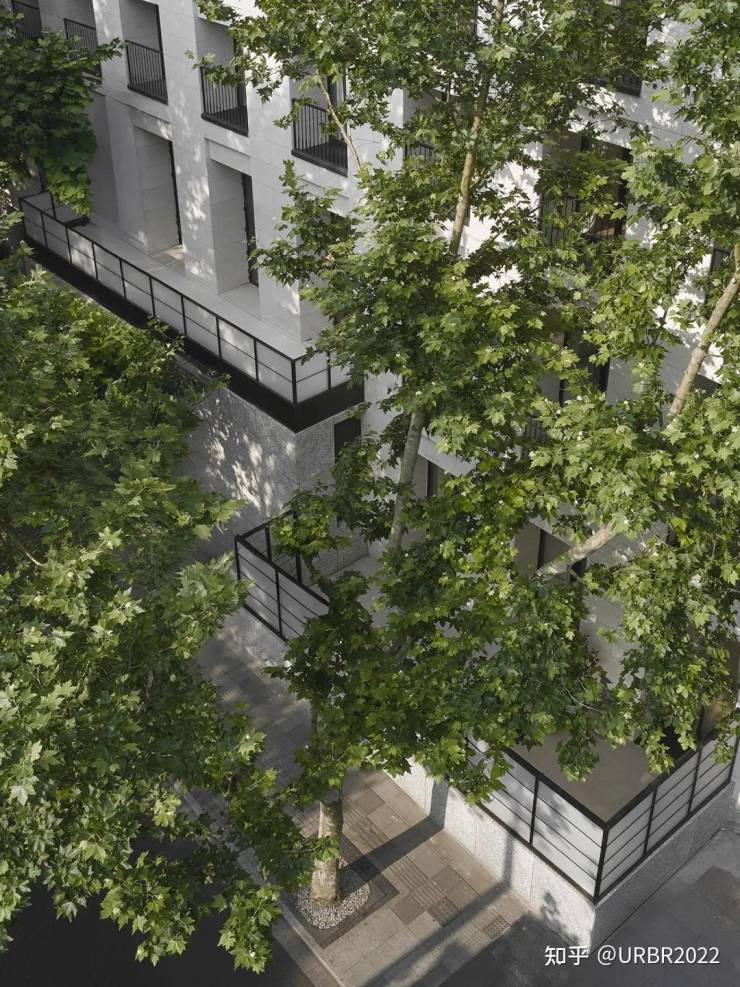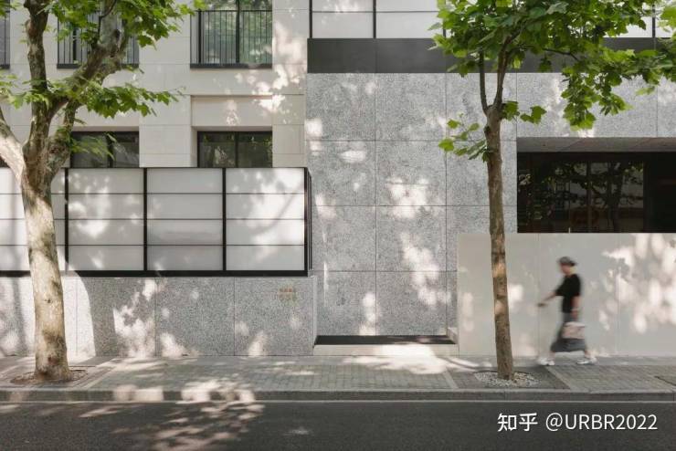 无间设计选择让建筑立面改造顺应这条街的呼吸,以简洁的线条、考究的材质和光影的运用,使建筑与梧桐树影、街巷氛围自然交融。
