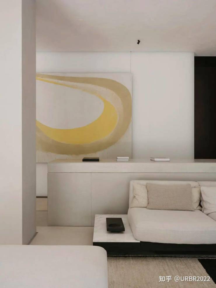 客厅,是流动的舞台。空间并未急于展露全貌,而是通过门厅的尺度收缩,让视线在穿越的瞬间豁然开朗。层次分明的布局与克制的光影,窗洞有序排开,使空间具备视觉上的节奏感,也赋予了生活序列感。当人们于客厅交谈、阅读、静坐,生活便以不动声色的方式上演。