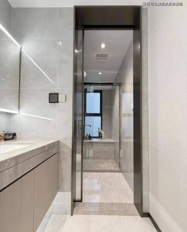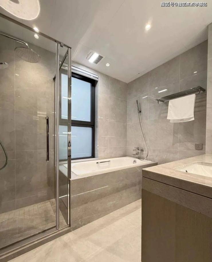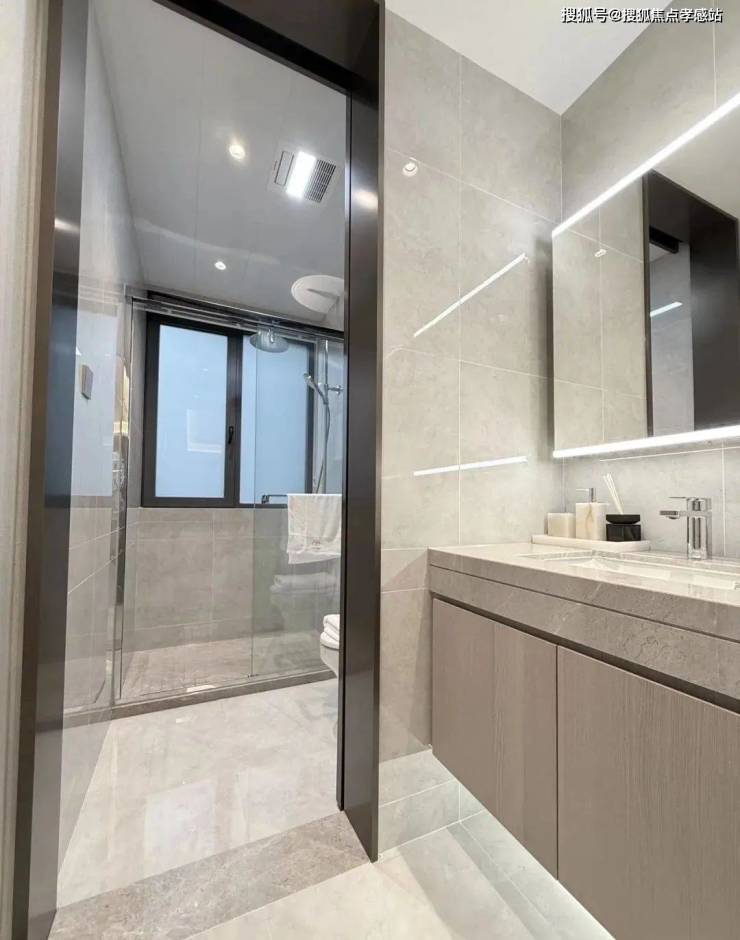 另外,一般百平米主卫淋浴房都是钻石型的,但项目是“一字型”的。“一字型”相比“钻石型”,洗澡空间更大,哪怕带着小朋友也不用挤得“转圈圈”,舒适度提高了不止一点点。