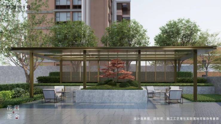 结合美学思考打造的花间茶舍凉亭,于此闲坐可尽享海派生活的典雅志趣。