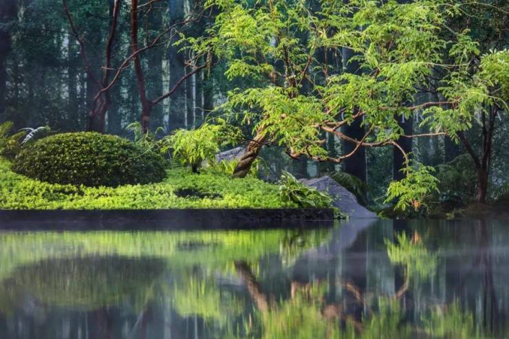 中建玖上琅宸以豫园为灵感,打造了一座当代山水隐园。在社区内部,遵循豫园“山脉+水脉”的布置手法,全冠移植了包括乌桕树、百年罗汉松、红枫、铁冬青等众多来自全国的昂贵树种,引水入园,庭荫树影,形成立体的山水园林景观。