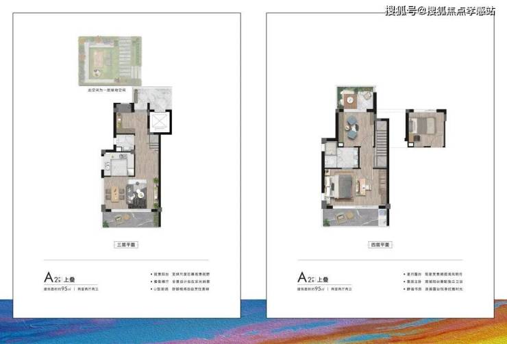:约 95㎡户型拥有约 5.1 米大面宽,一层层高约 3.2 米,使得居室内采光观景效果更佳;主卧带观景阳台的设计,让四季景观尽收眼底。