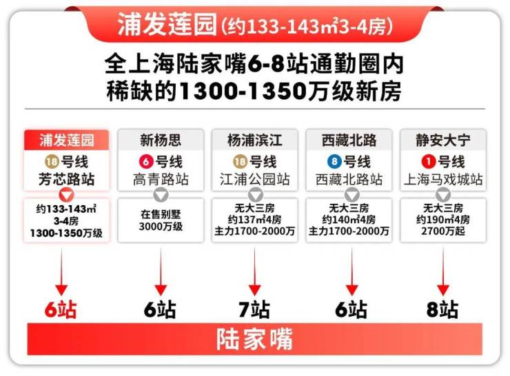 浦发莲园是陆家嘴6-8站通勤范围内质价比最高的改善选择。同圈层对比下,杨浦滨江、西藏北路等板块普遍缺失舒适大三房,功能性四房总价已普遍站上1700万+。